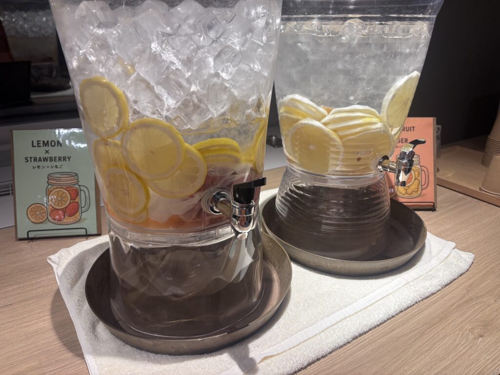 デトックスウォーターはレモンといちご、レモンとジンジャーの2種類ありました!